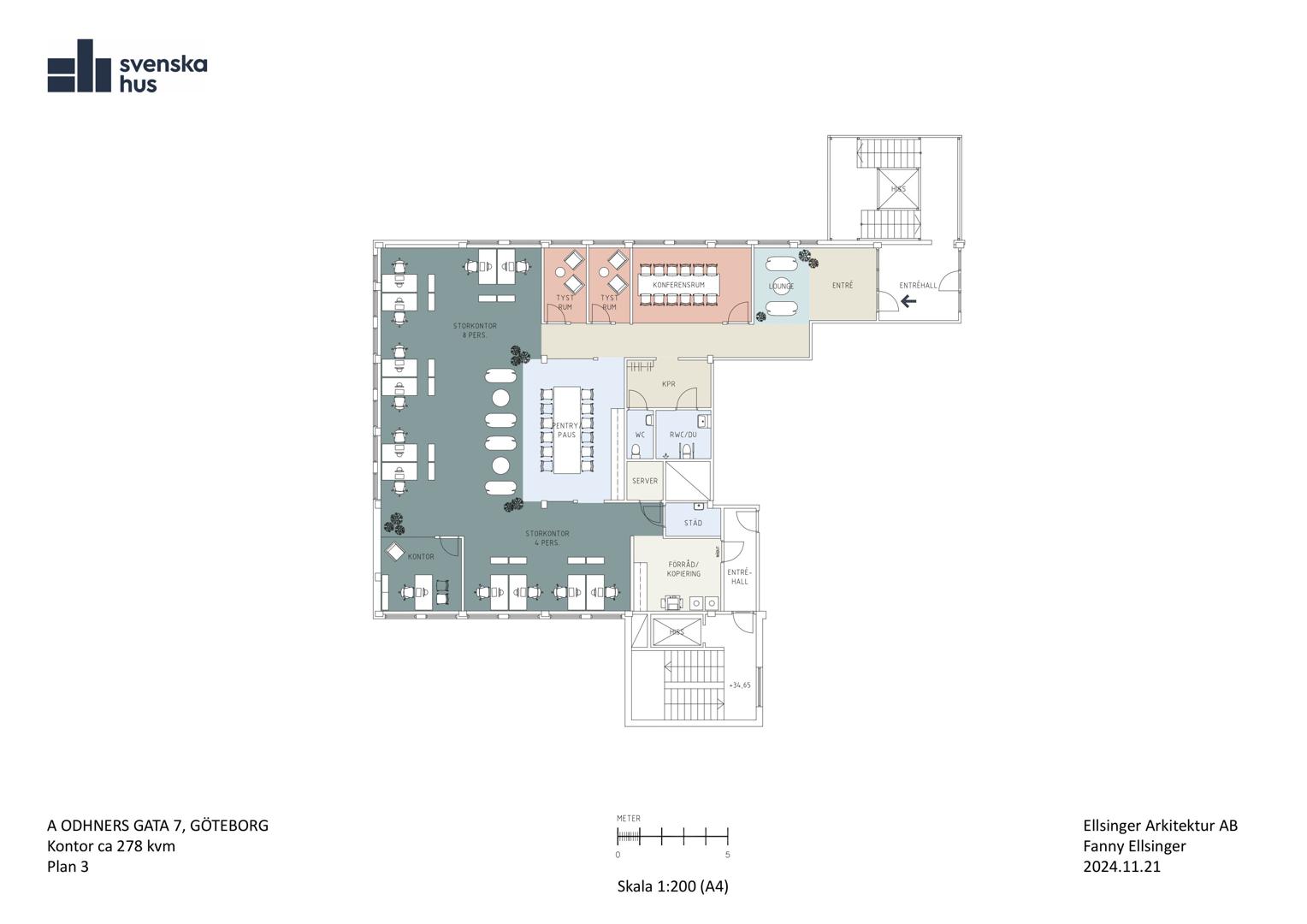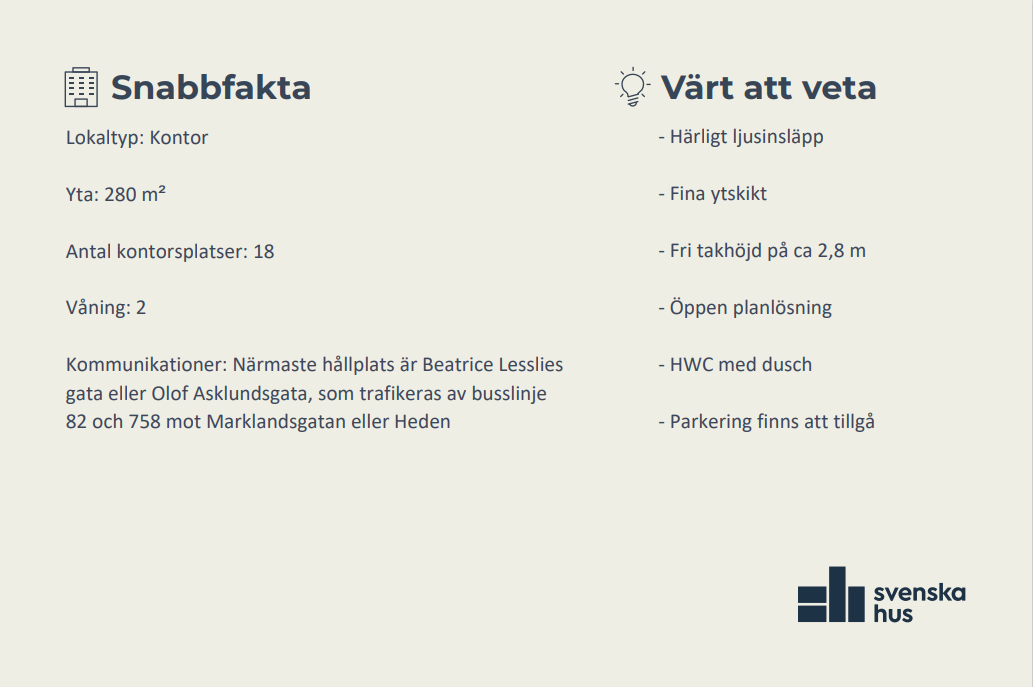Välkommen till ett fint kontor beläget i hjärtat av Högsbo. Här möts du av en trevlig loungeyta, direkt efter finner du ett konferensrum som rymmer 12 personer. Lokalen erbjuder en till största delen öppen planlösning med fina ytskikt i moderna färger. Här finns också två tysta rum, ett kontor eller mindre mötesrum, förråd, två WC varav det ena är HCP anpassat och har dusch samt ett öppet pentry med plats hela personalen.