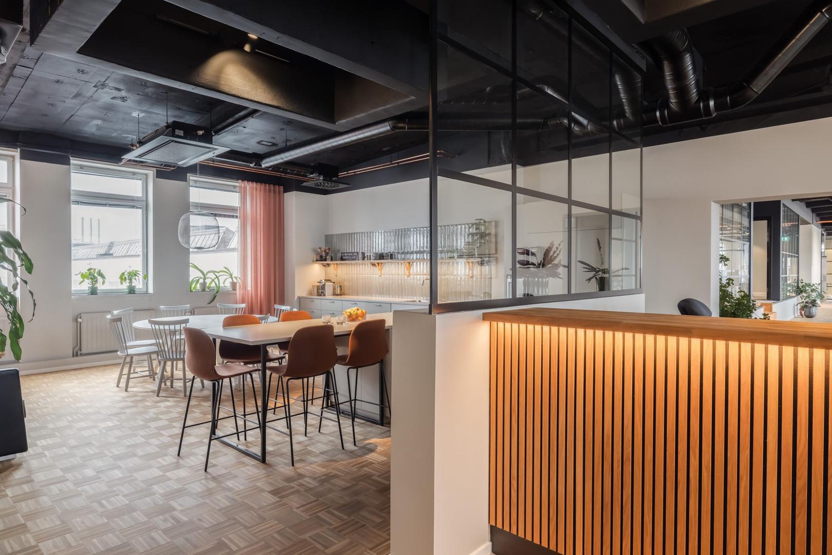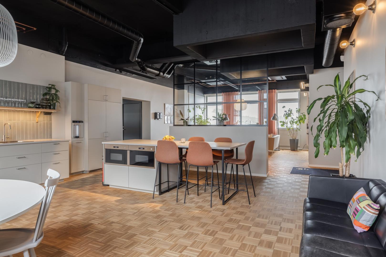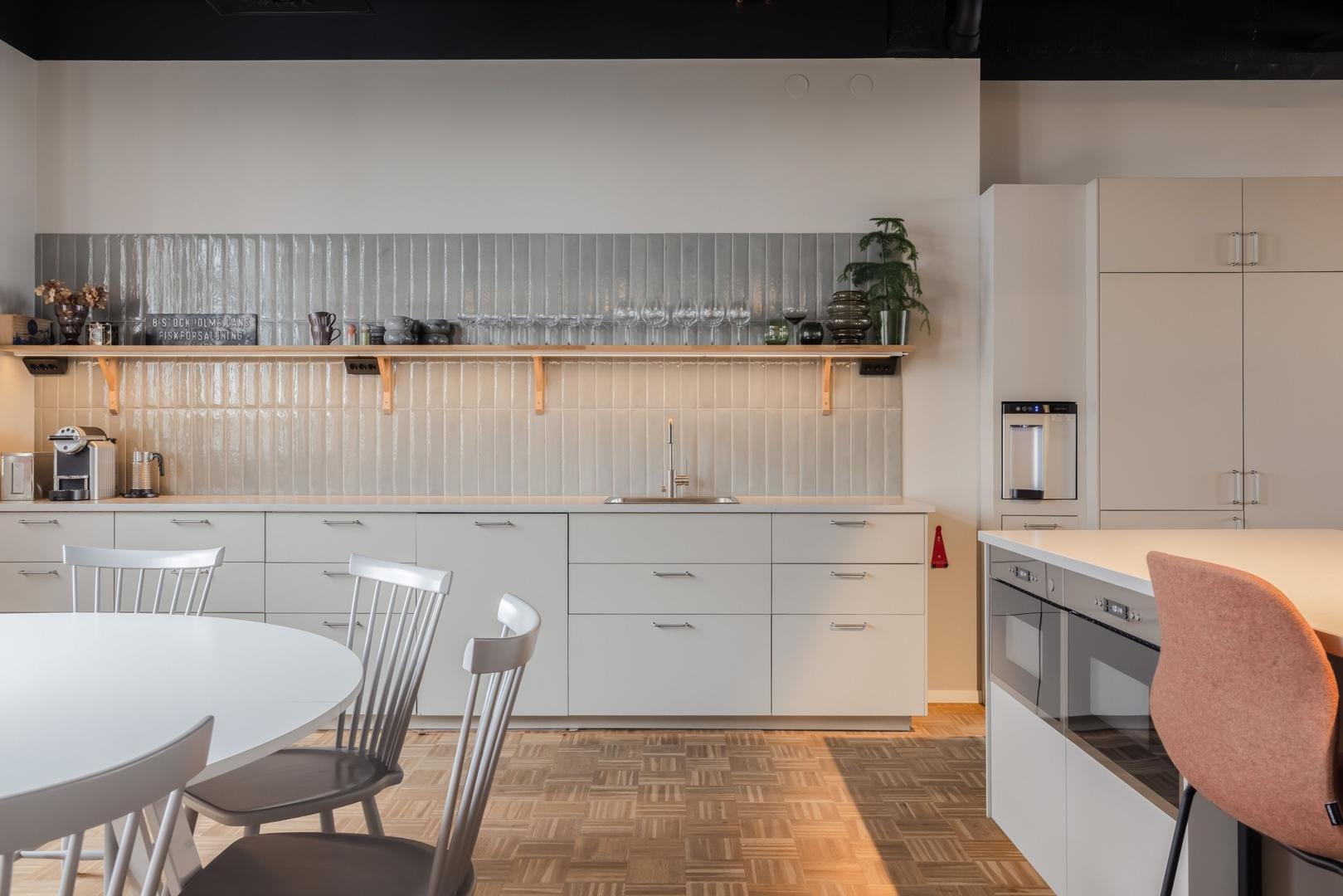 Det inbjudande köket är placerat nära entrén och är utrustat med en rymlig köksö samt ytor för gemensam mat och mer informella möten. Den placeringen gör det enkelt att kombinera fika- eller lunchpauser med nätverkande och social samvaro.