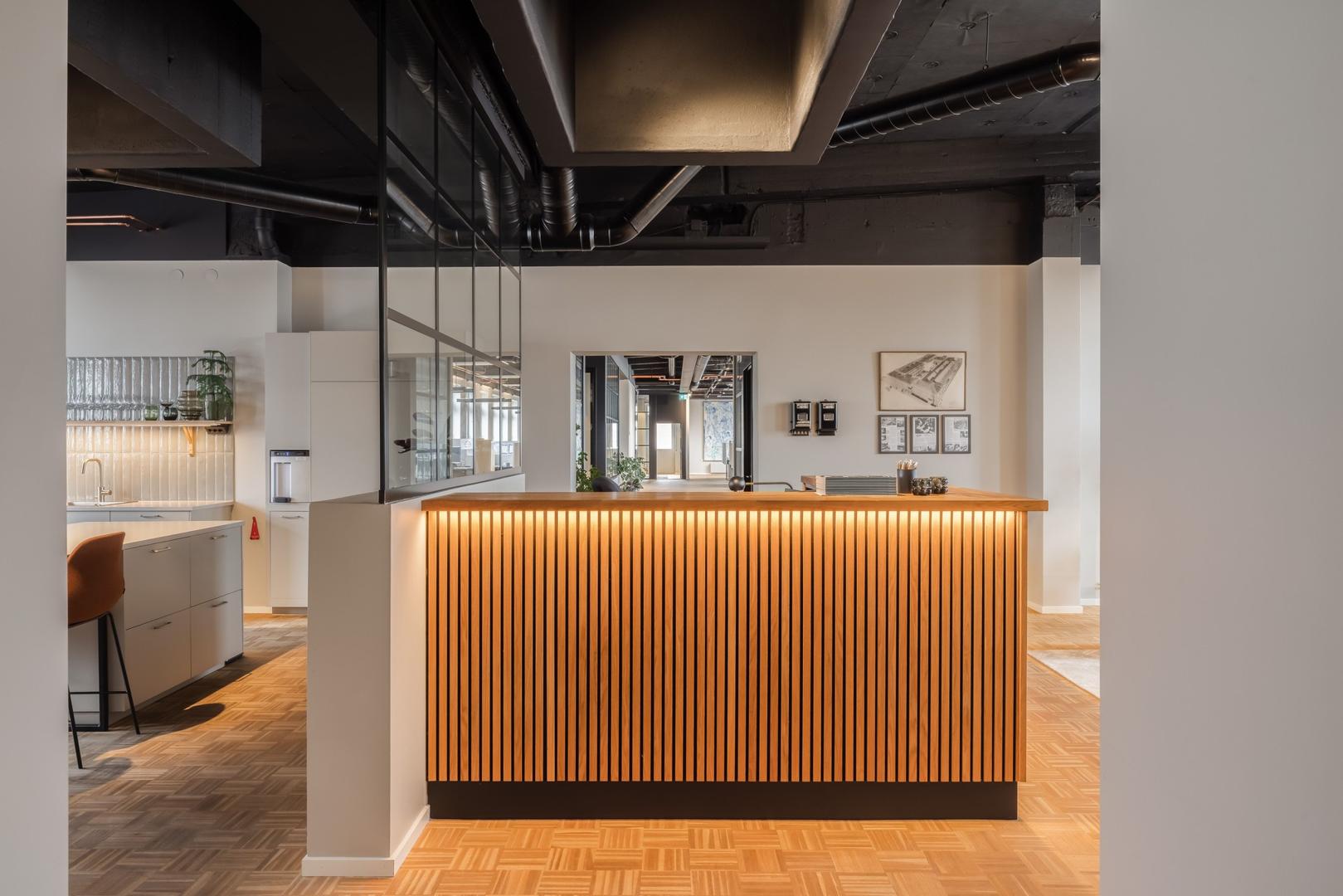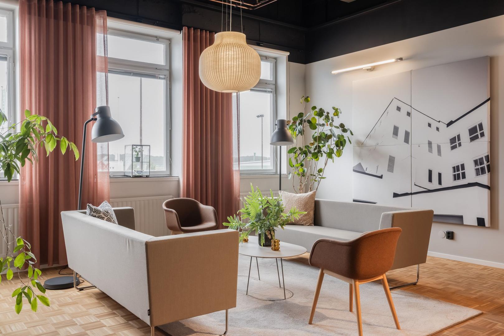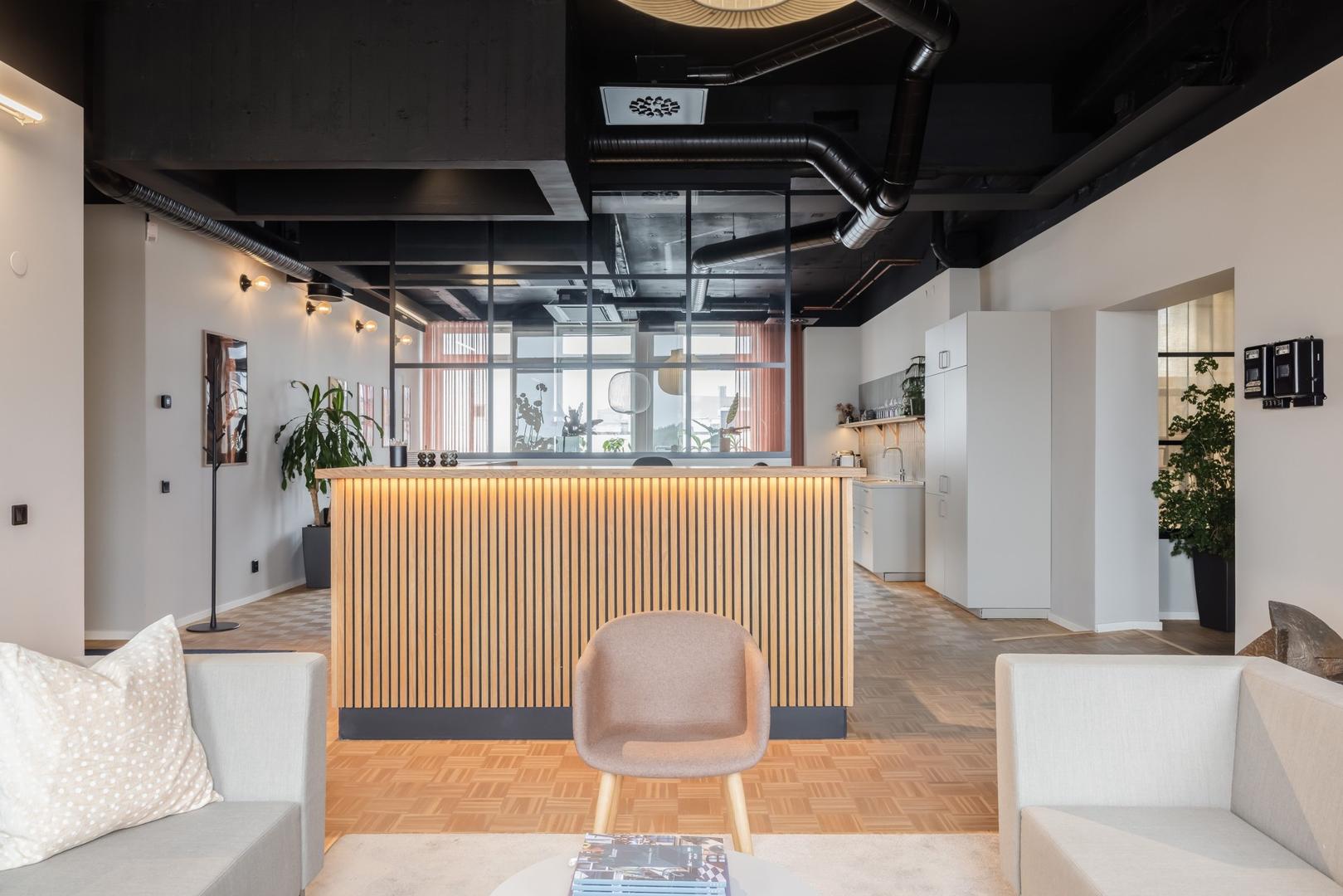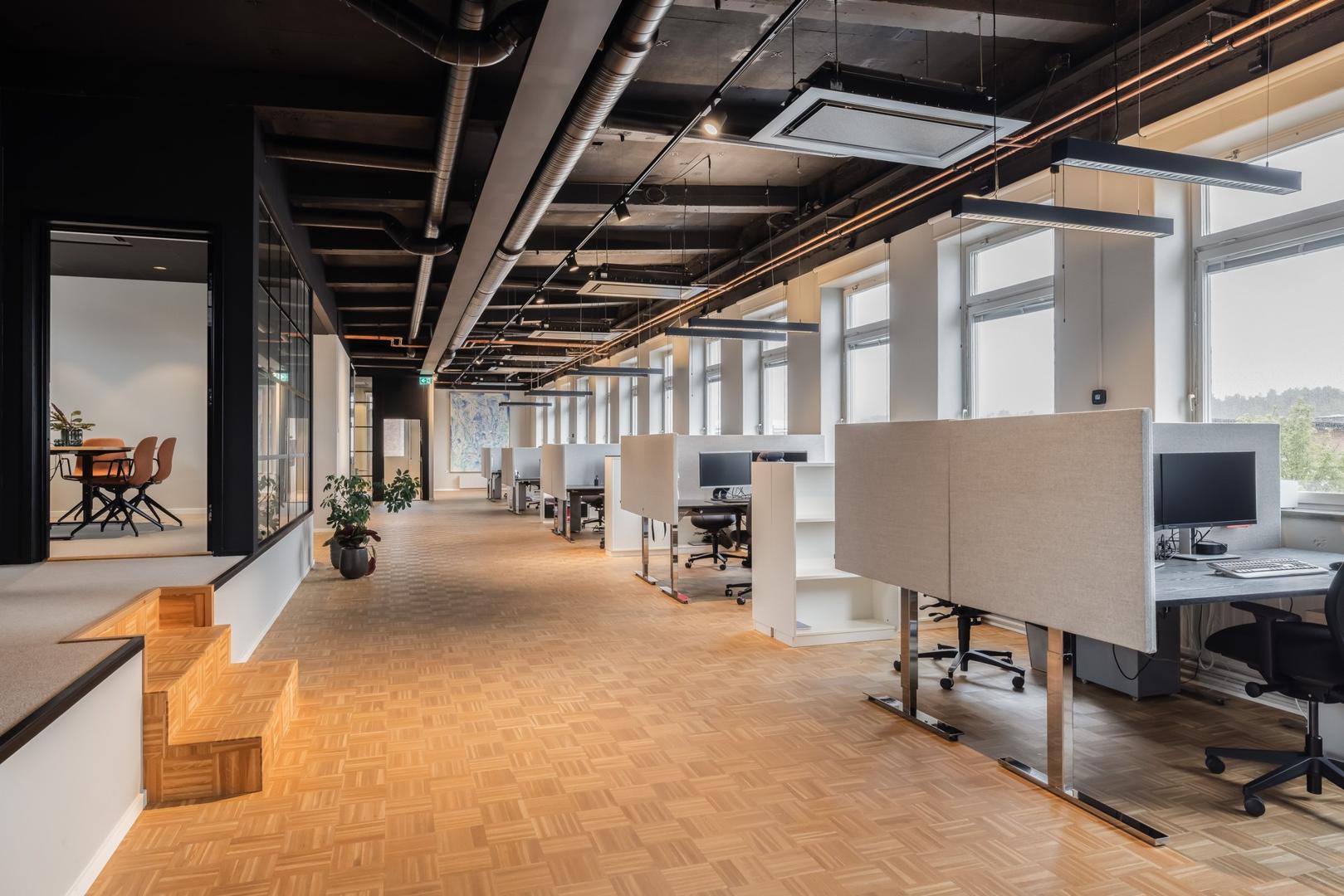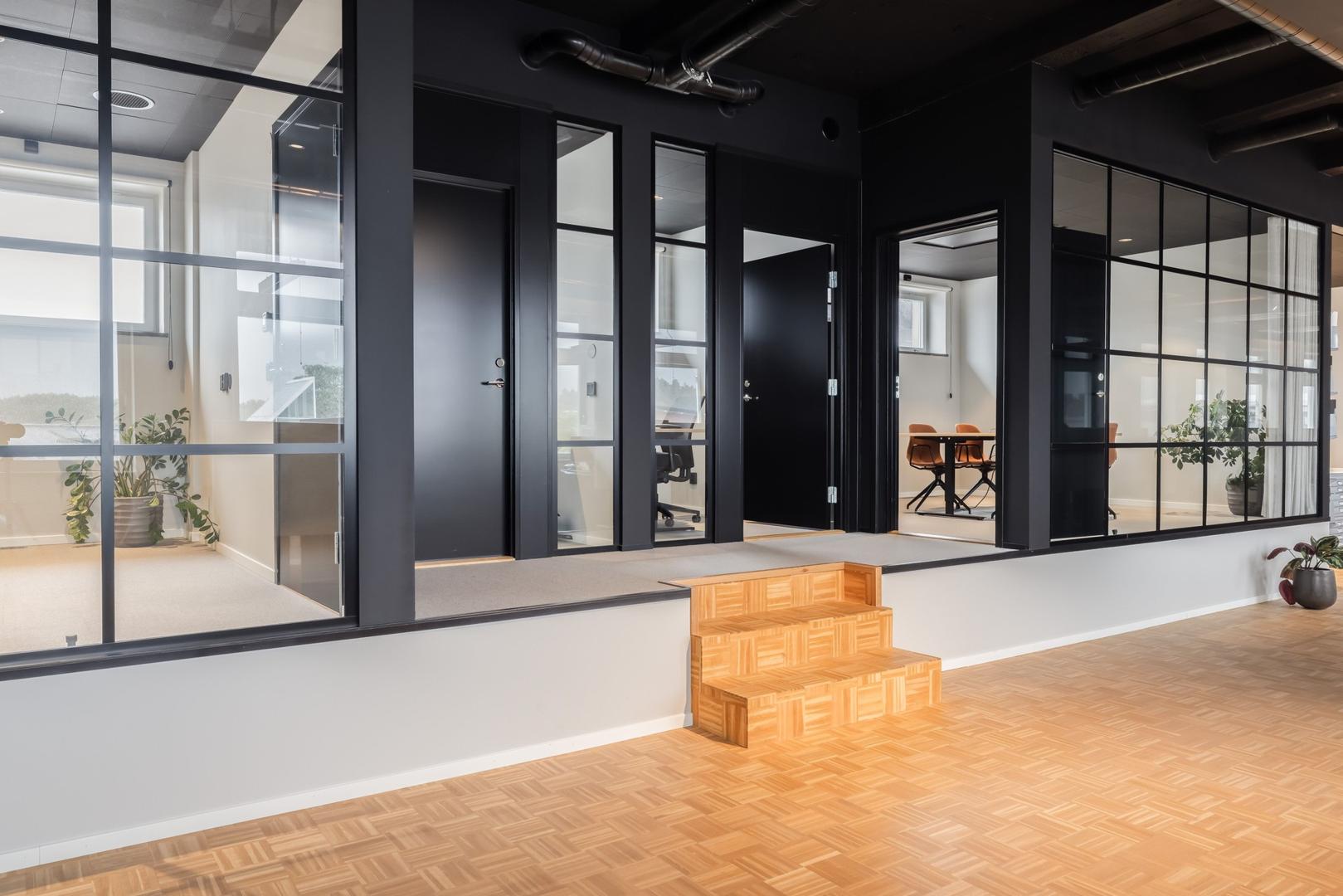 Med en takhöjd om cirka 4 meter upplevs en luftig känsla som stimulerar kreativitet och trivsel. Det svarta innertaket, där ljudabsorbenter målats i samma ton, ger en stilren men samtidigt funktionell yta med god akustik. De stora fönsterpartierna fyller lokalen med naturligt ljus och stärker både välmående och produktivitet.