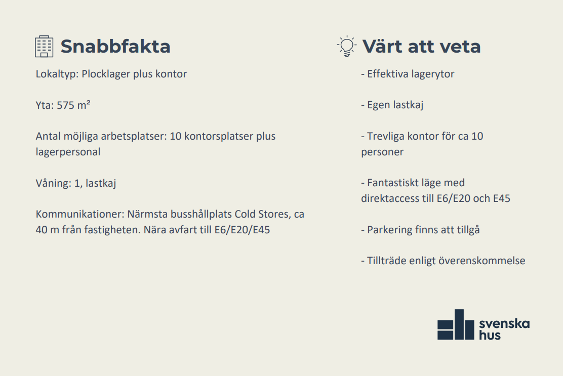 Med utmärkt läge och närhet till de stora lederna finns nu en lager- och logistiklokal om totalt 575 m² att hyra. Lagerytan är ca 512 m² och kompletteras med ett kontor om ca 63 m². Lokalen erbjuder fem kontorsrum, varav två ligger i anslutning till lagret. På samma plan finns även pentry och WC.