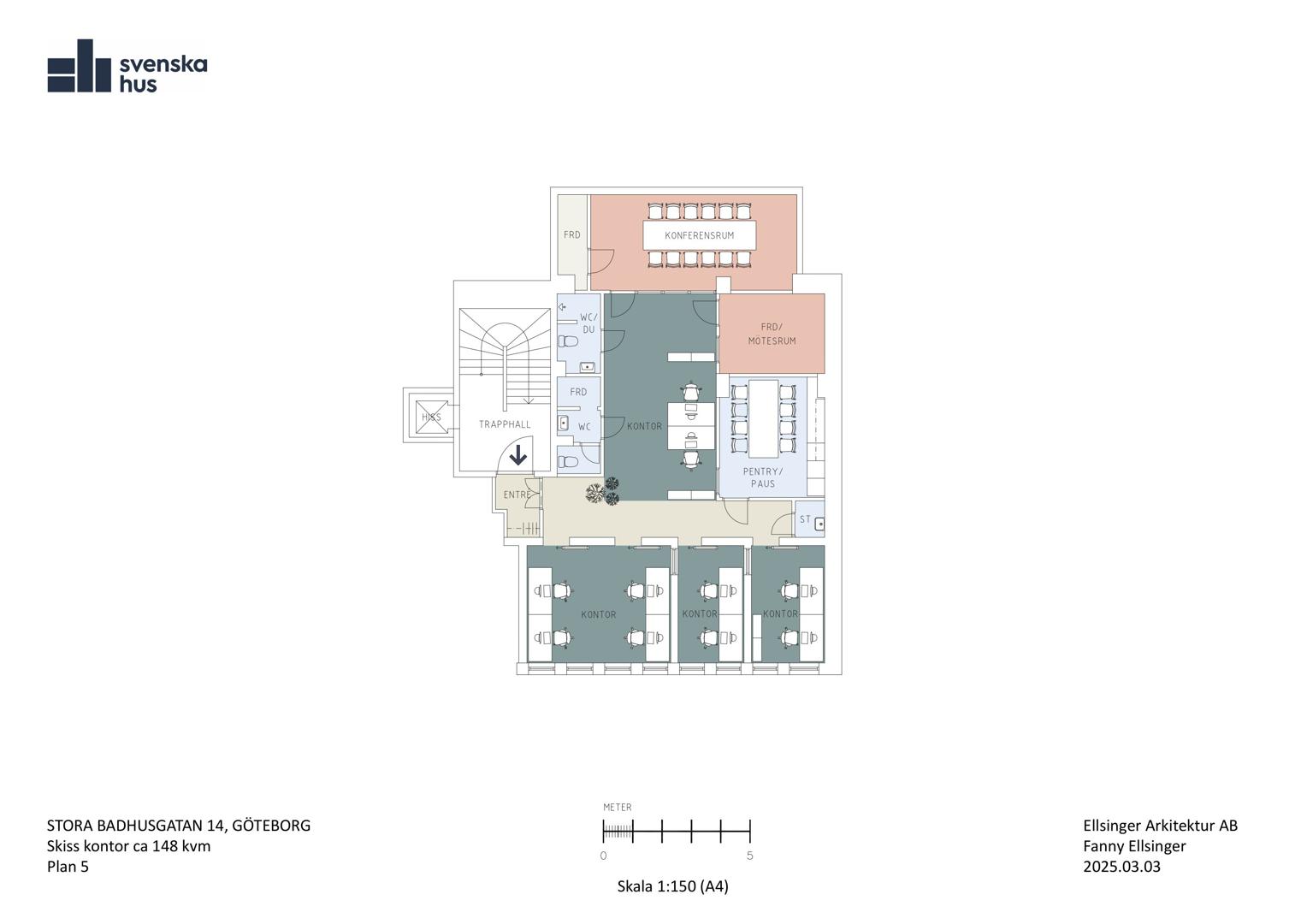 Kontoret erbjuder två WC varav det ena med dusch, tre kontorsrum med fönster åt älven, två mötesrum varav det ena är lite större och rymmer 8-10 personer. Här finns också en öppen loungeyta som binder samman de olika rummen.
