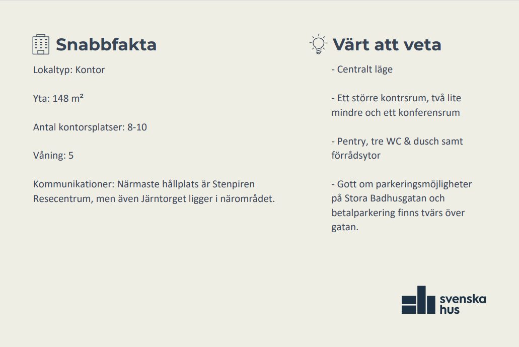 Knutpunkten Stenpiren Resecentrum med all tänkbar kommunikation ligger ca 50 meter från fastigheten. Även Järntorget, med sina omkringliggande långgator, ligger nära. När västlänkens station i Haga står klar kommer du även ha nära till lokala förbindelser ut i landet. Det finns gott om parkeringsmöjligheter på Stora Badhusgatan och betalparkering finns tvärs över gatan.