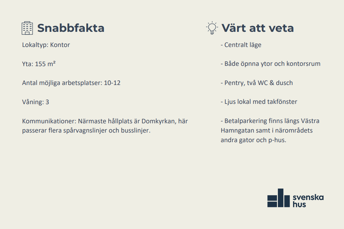 Vi kan nu erbjuda en fantastiskt ljus och trevlig kontorslokal om ca 155 m² på en av Göteborgs bästa adresser. Lokalen som är belägen högst upp i huset består av öppna ytor, ett antal kontorsrum/mötesrum och en härlig öppen entré. Dessutom finns det ett trevligt kök och två WC:n samt dusch. Ytskikten i lokalen består av ljusa väggar och ett ljust brädgolv som tillsammans med andra charmiga detaljer såsom exempelvis flera takfönster skapar en trevlig arbetsmiljö.